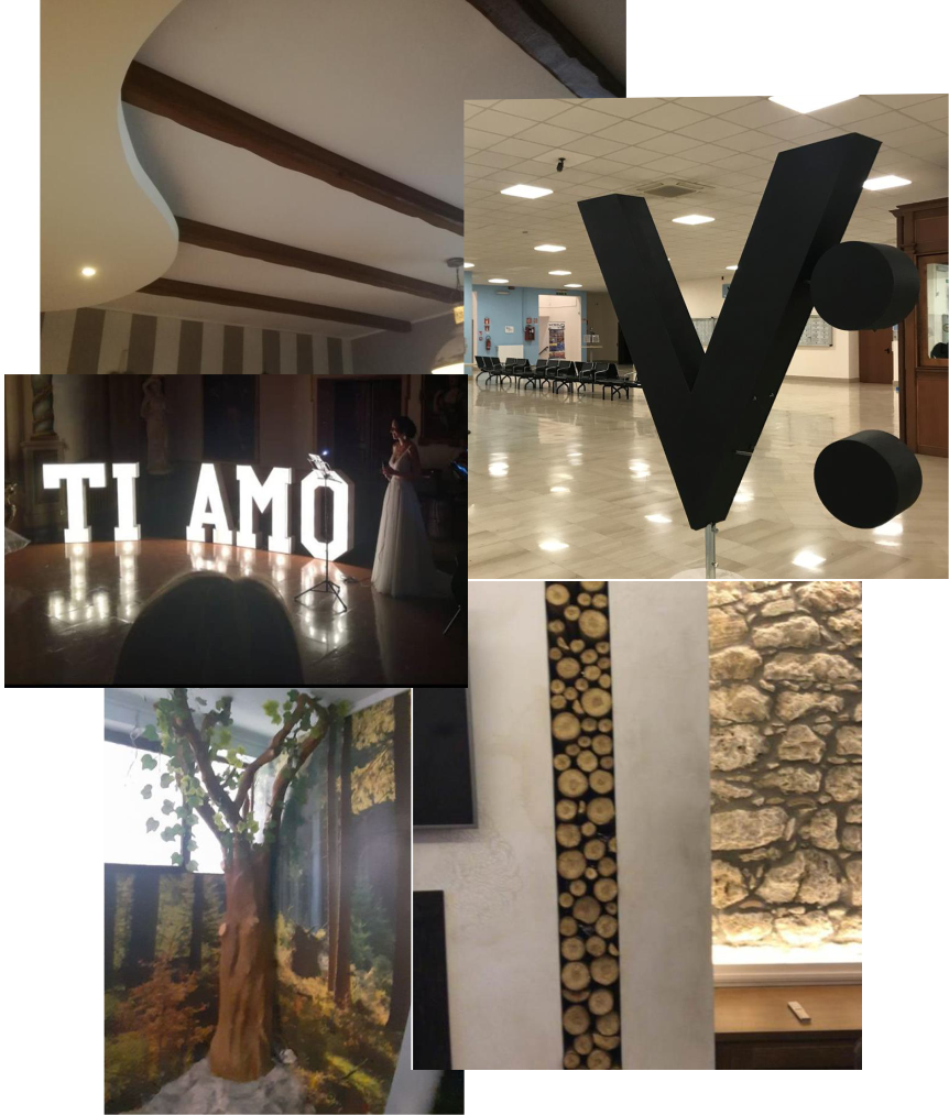 Il taglio, la modellazione, la resinatura e la colorazione del polistirolo per creare scenografie di grande impatto visivo con costi contenuti. Progettazione e realizzazione di locali pubblici. Insegne 3D in polistirolo, legno, forex o plexiglas. Stampa su vari supporti di piccole e grandi dimensioni. Travi finto legno. Prodotti per allestitori e organizzatori di eventi.